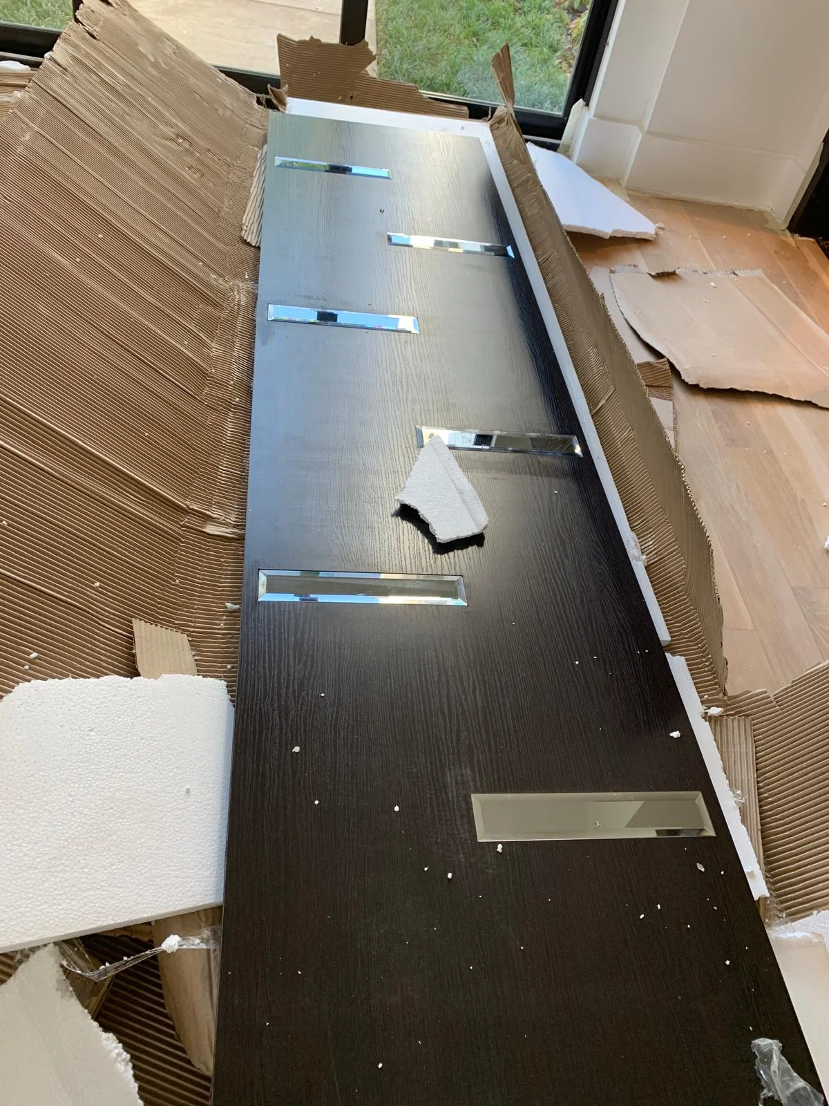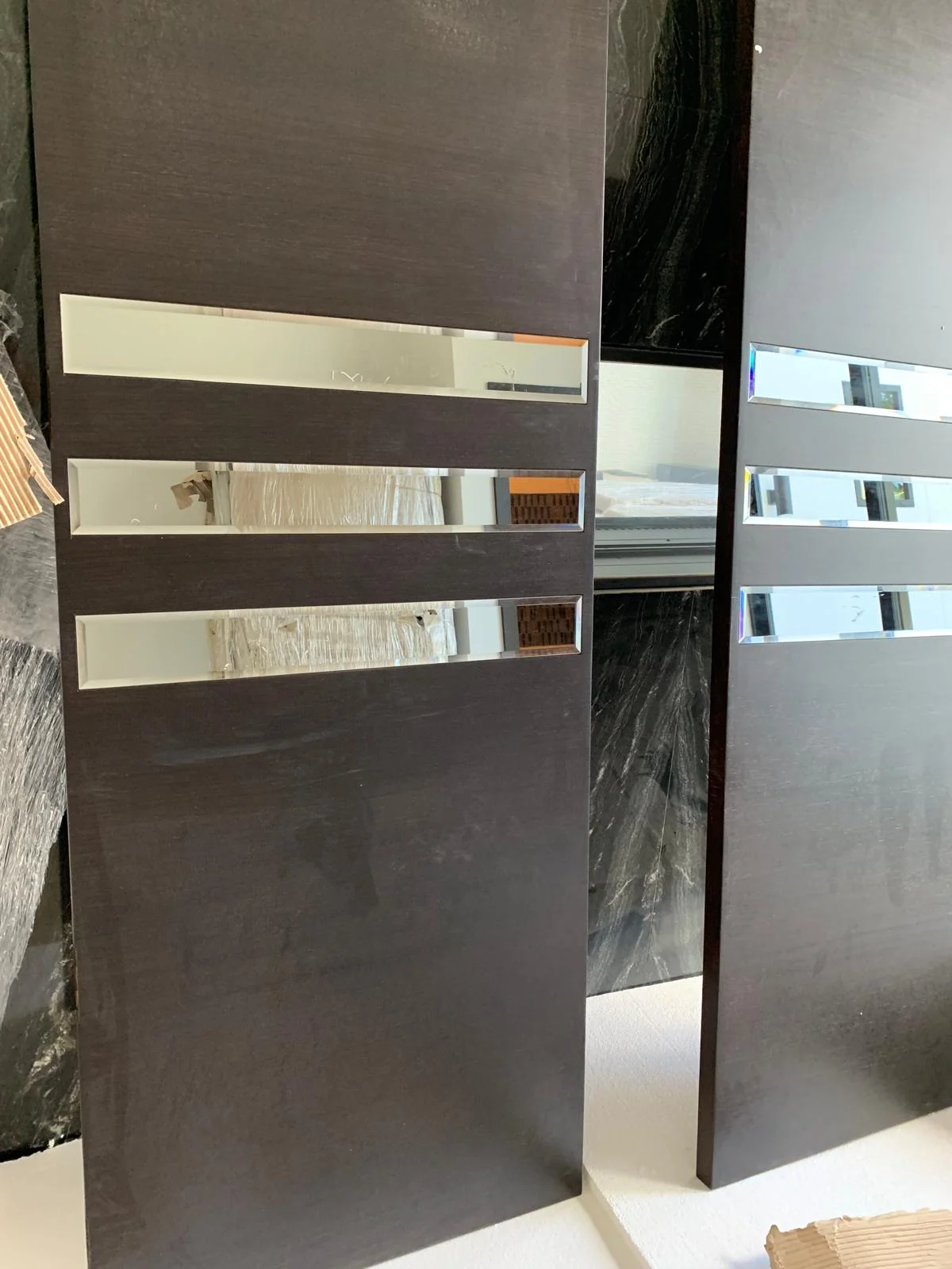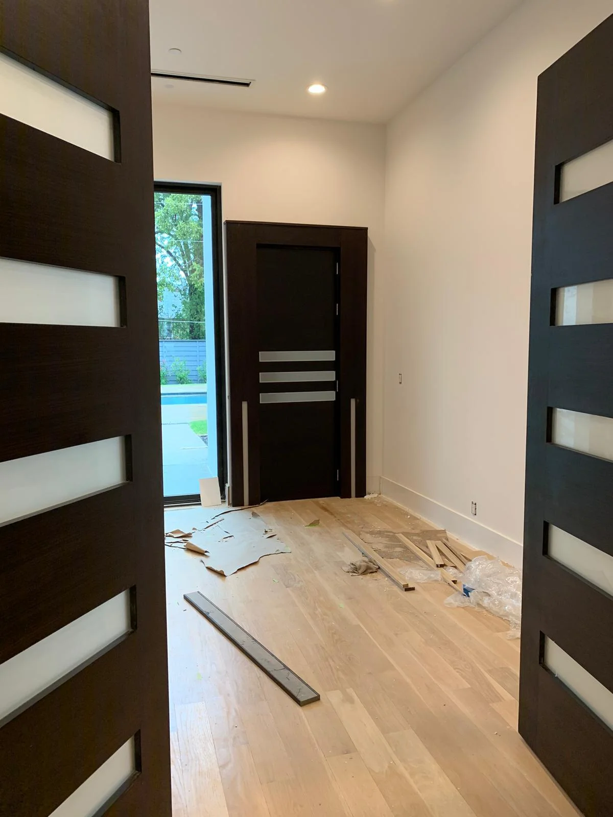 This modern interior showcases the installation of sleek, dark wood cabinetry and doors, accentuated with metallic inlays. The cohesive design theme combines elegance and functionality, ideal for contemporary living spaces. Work in progress indicates attention to detail and high-end finishes throughout the property.