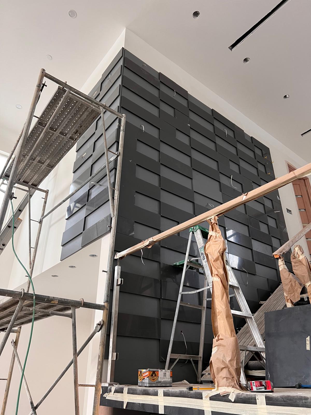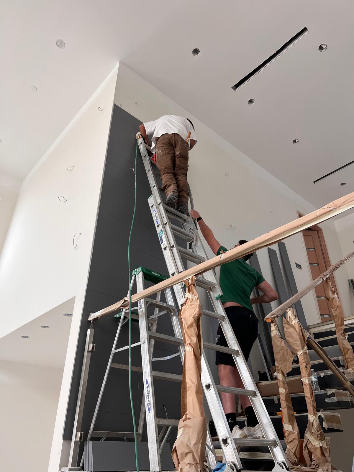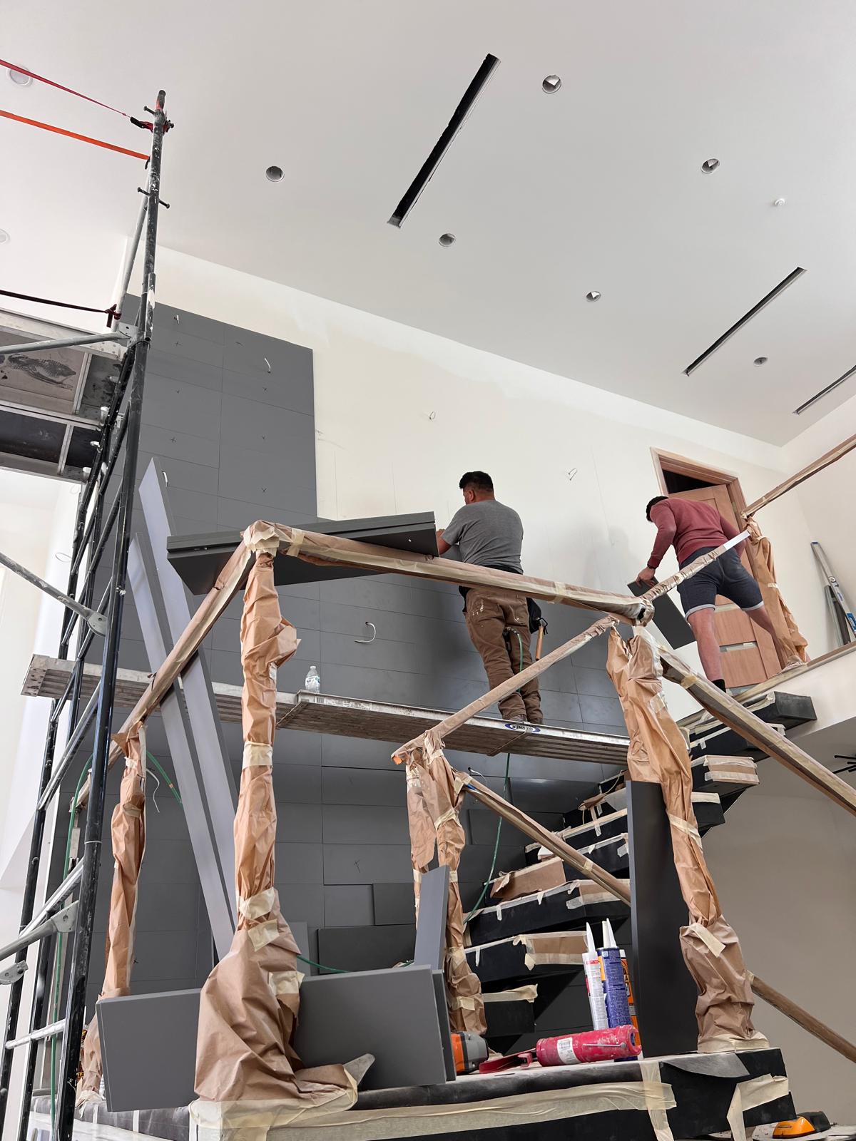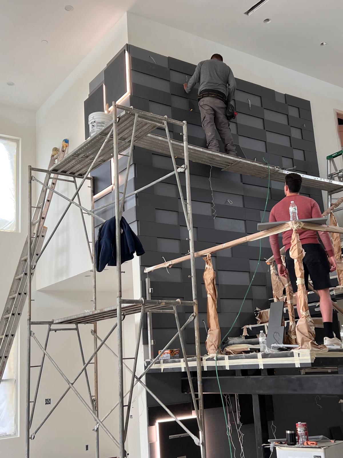 Custom residential wall design featuring a 3D layered wood panel effect. The installation is crafted in three stages—starting with a base layer, followed by a second and third dimension, enhanced with integrated hidden LED lighting. Each panel is custom-sized and precision-finished according to the initial plan. The entire design is developed by our team from concept to completion.