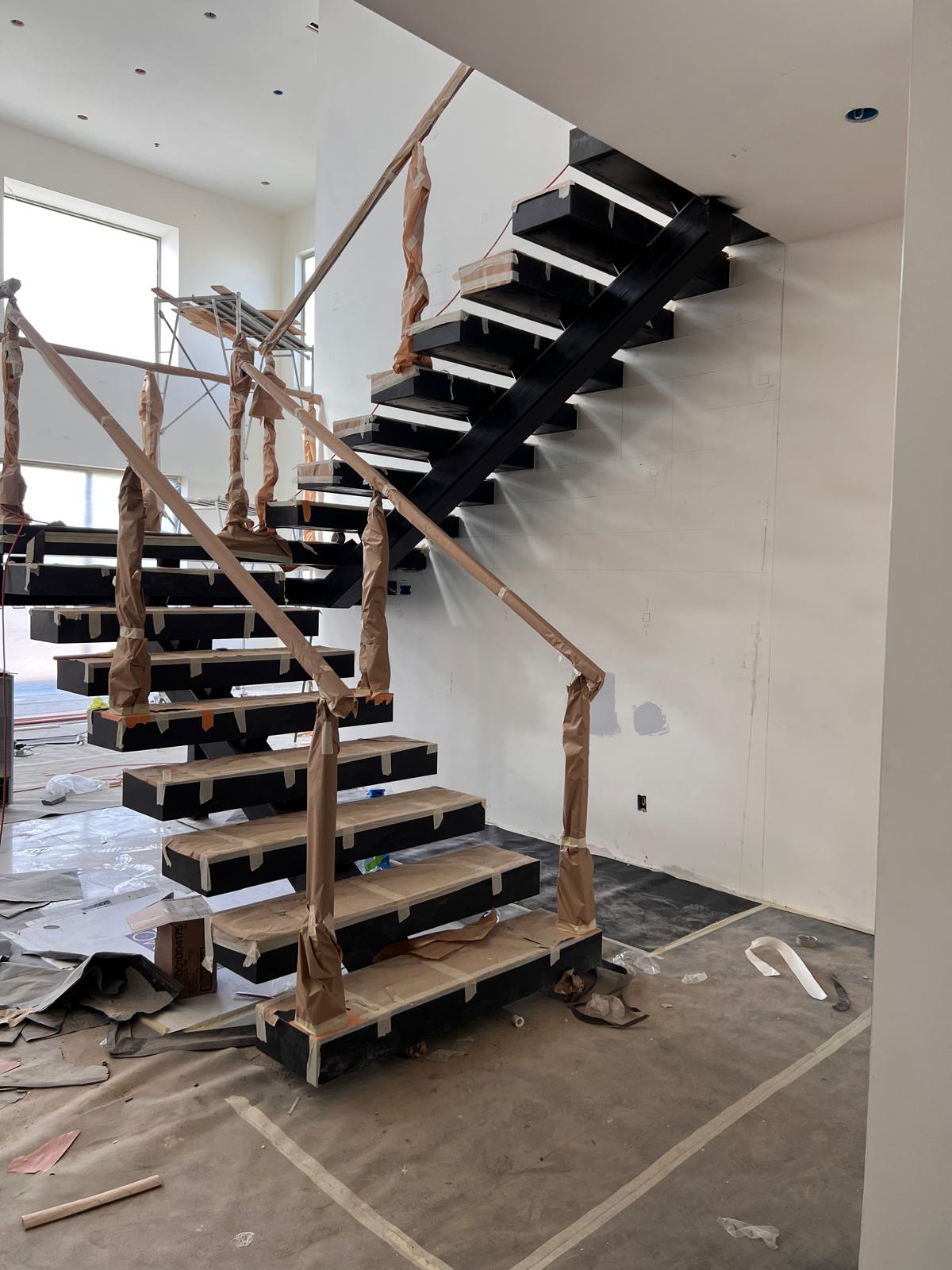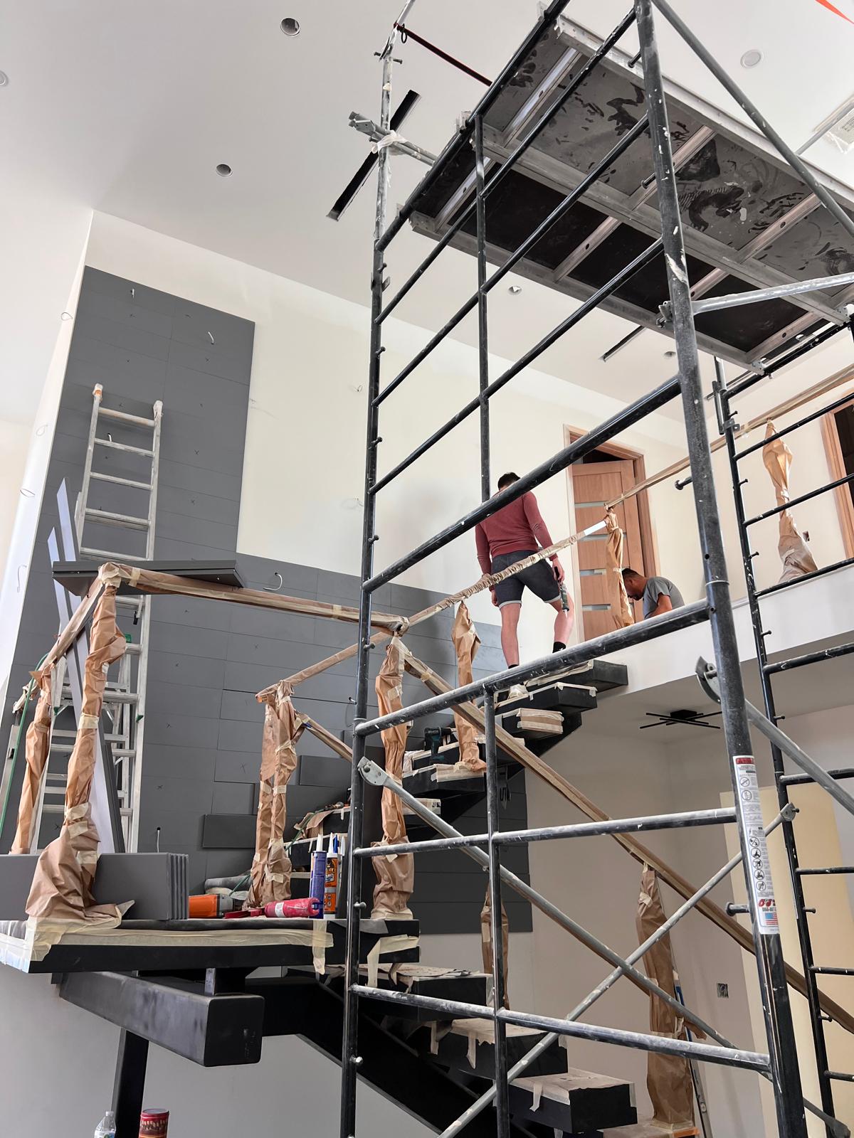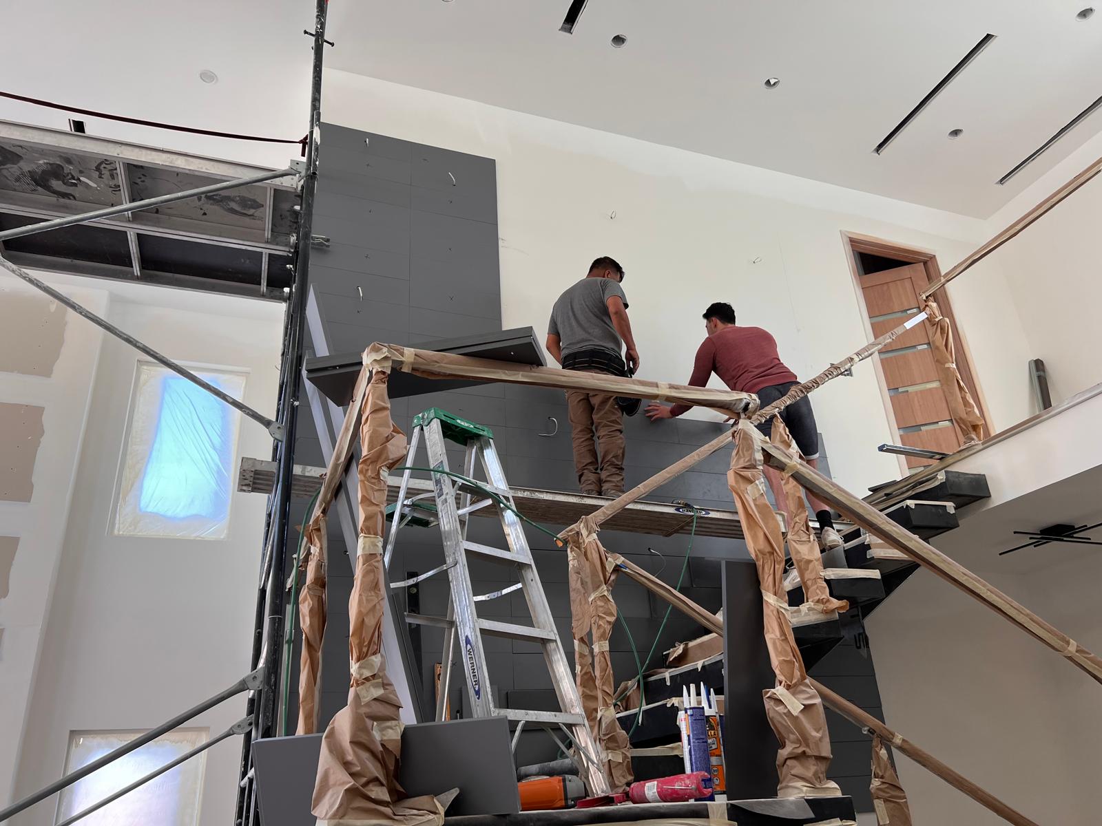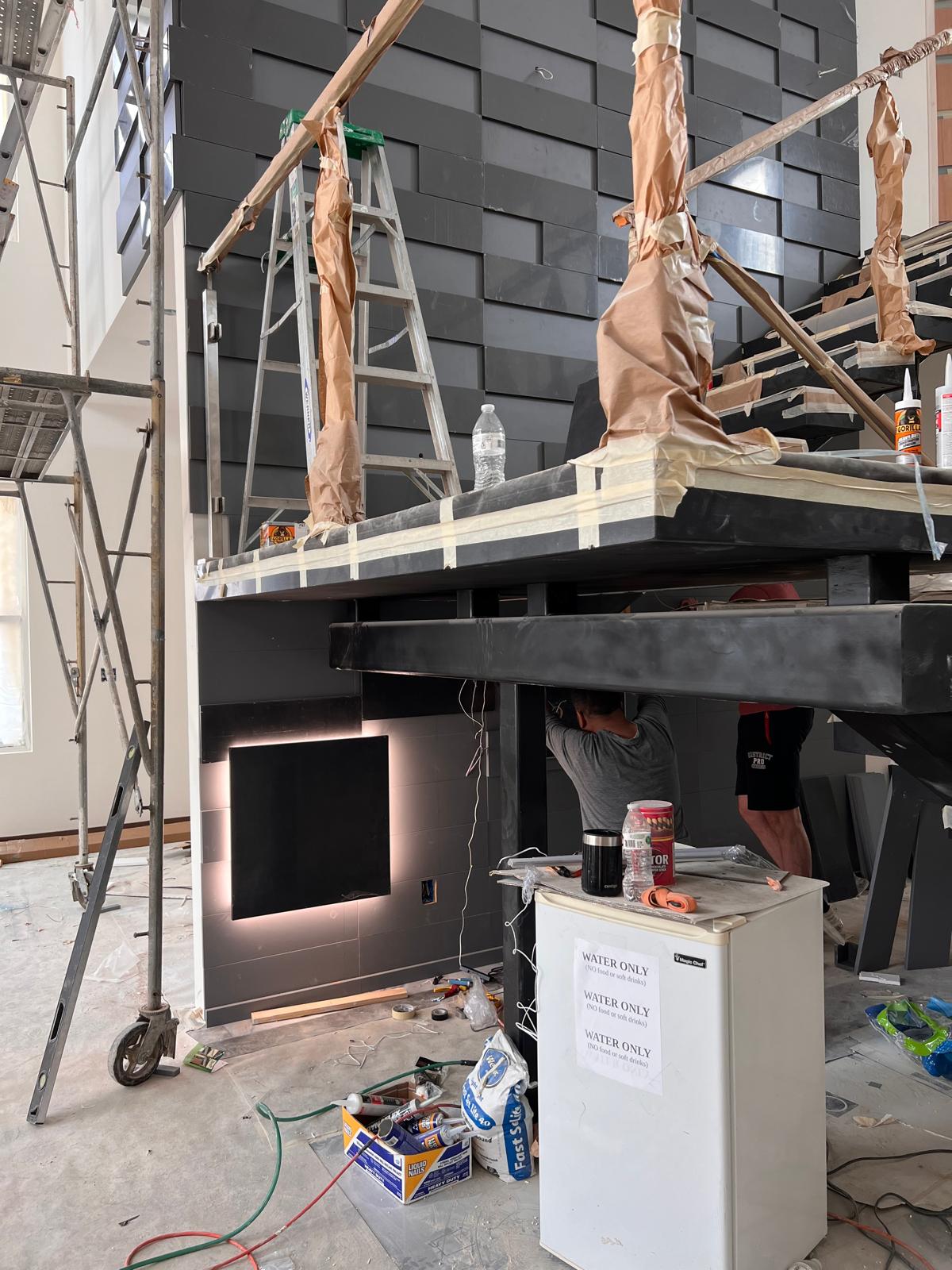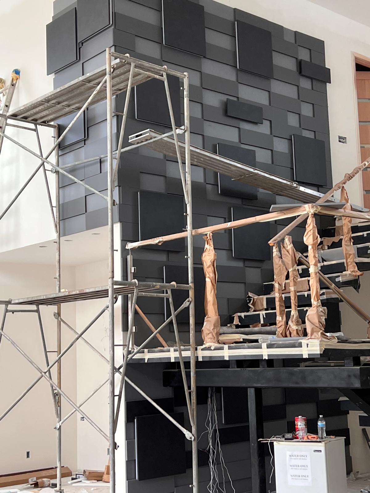Custom residential wall design featuring a 3D layered wood panel effect. The installation is crafted in three stages—starting with a base layer, followed by a second and third dimension, enhanced with integrated hidden LED lighting. Each panel is custom-sized and precision-finished according to the initial plan. The entire design is developed by our team from concept to completion.