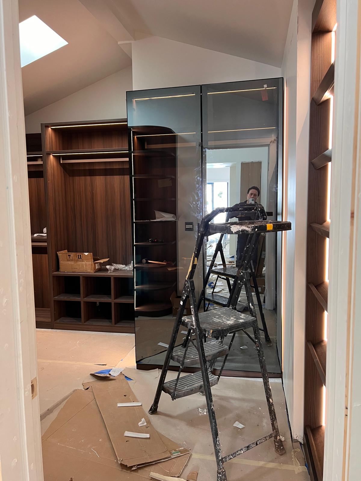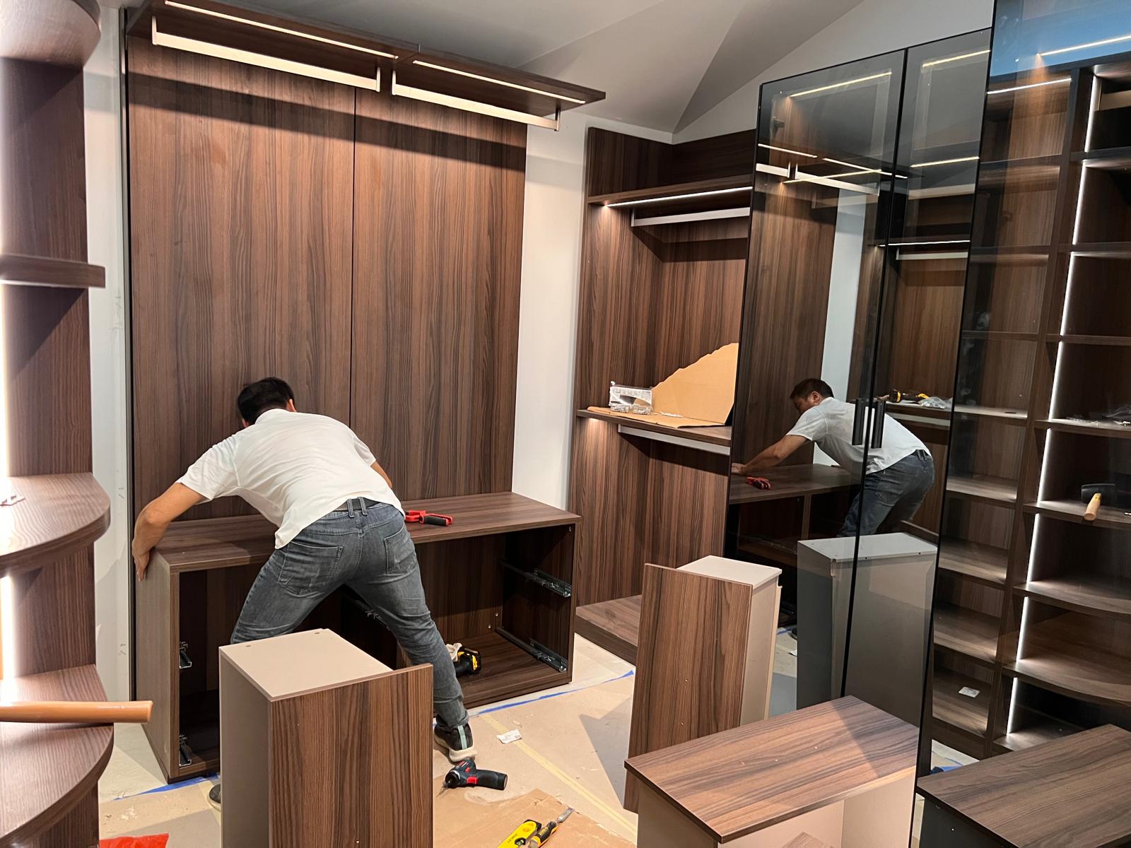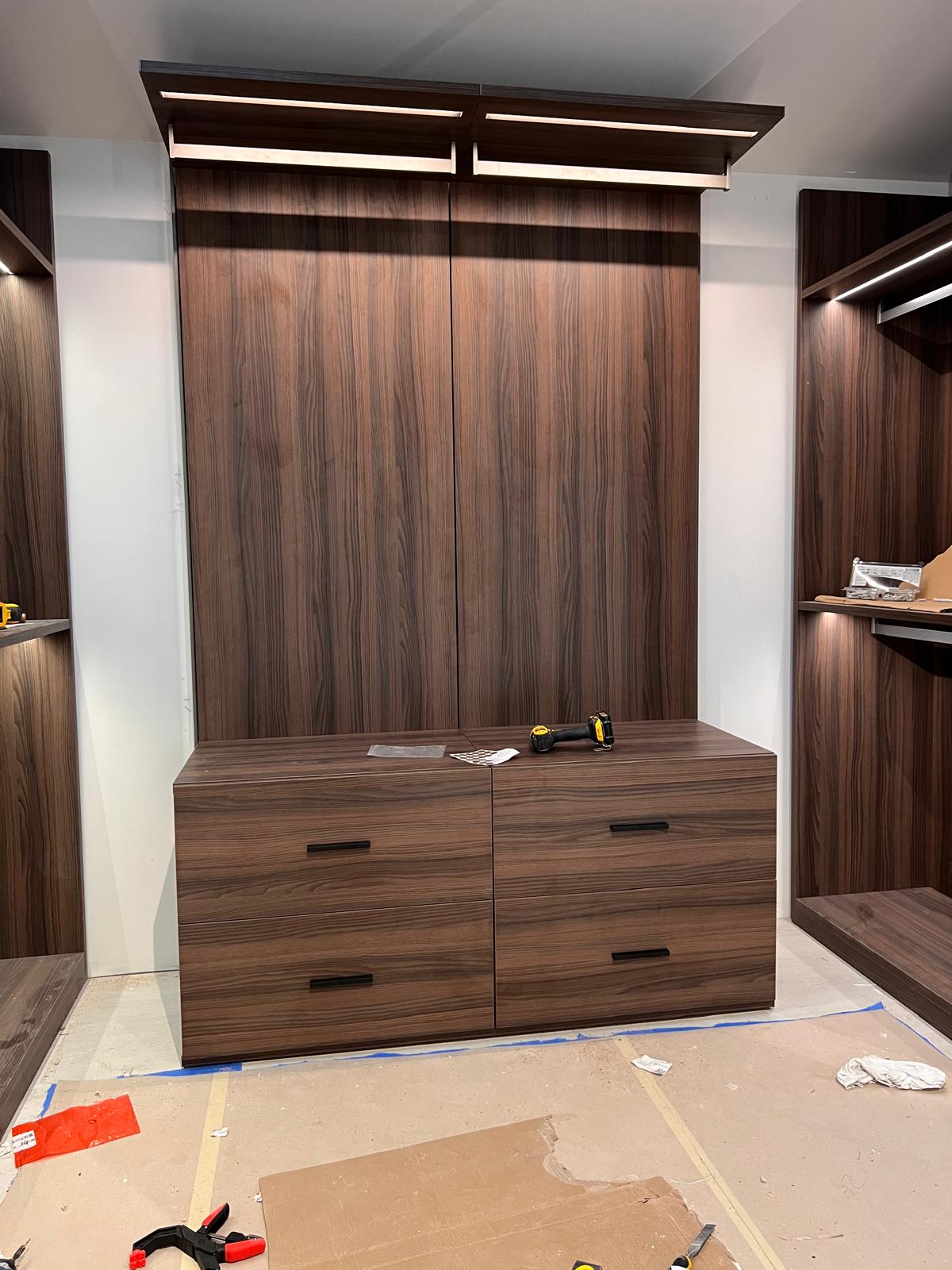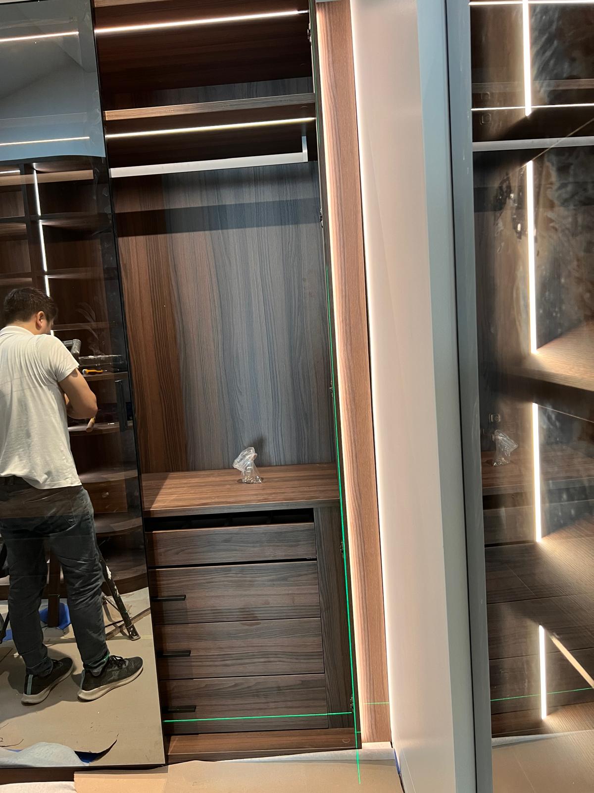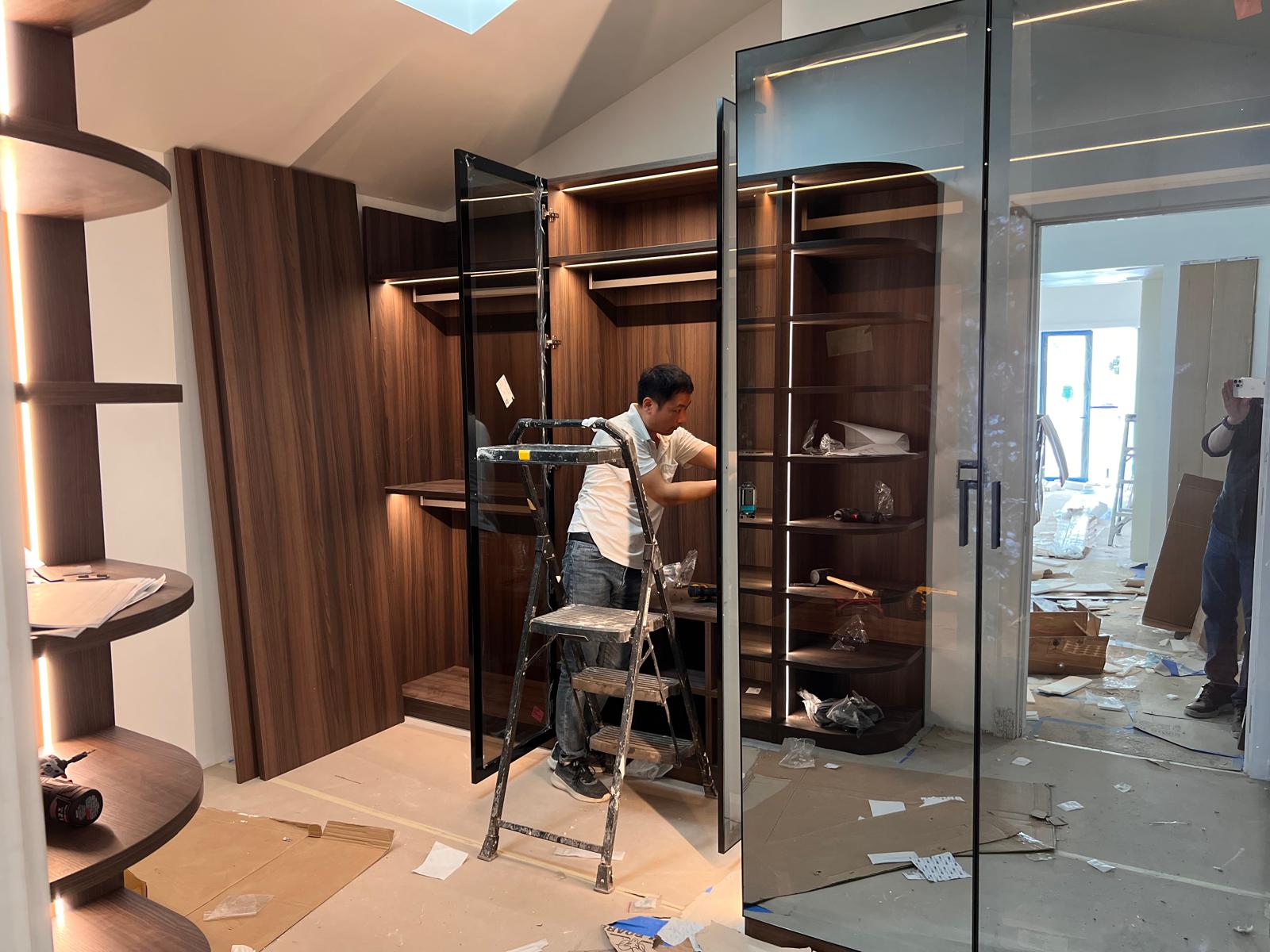 A sleek and modern walk-in closet is taking shape with premium wood finishes, integrated LED lighting, and tinted glass doors. The custom cabinetry and shelving are being carefully installed to create an elegant, functional space for organized living.