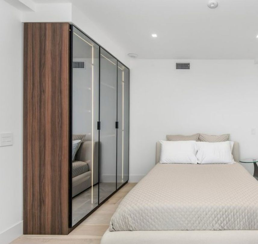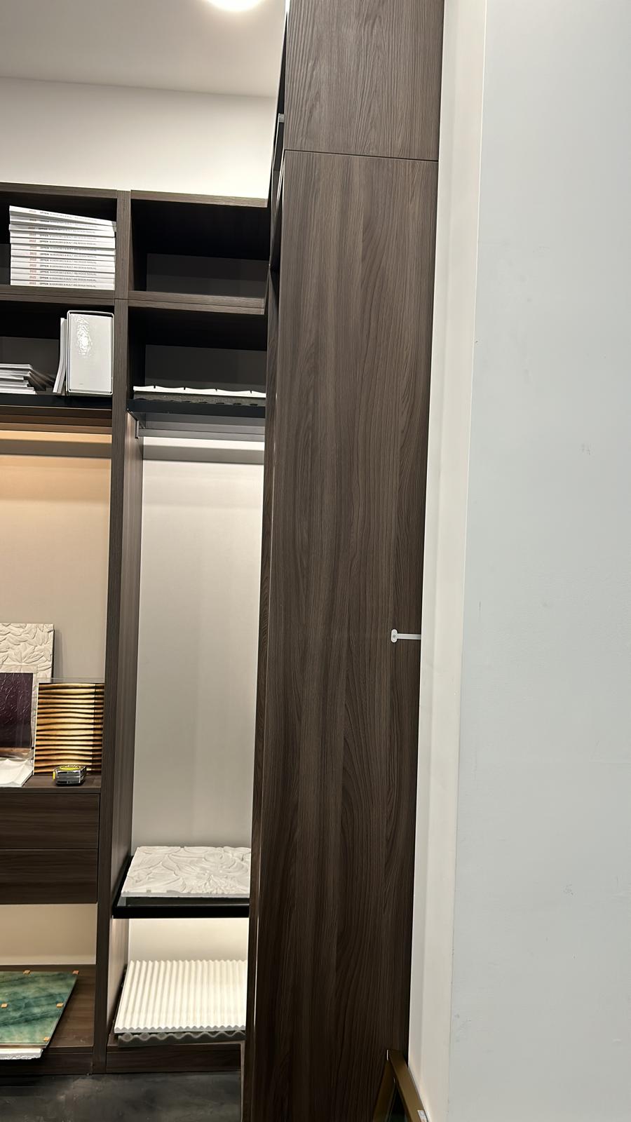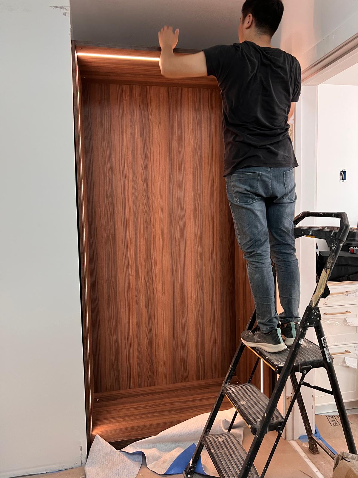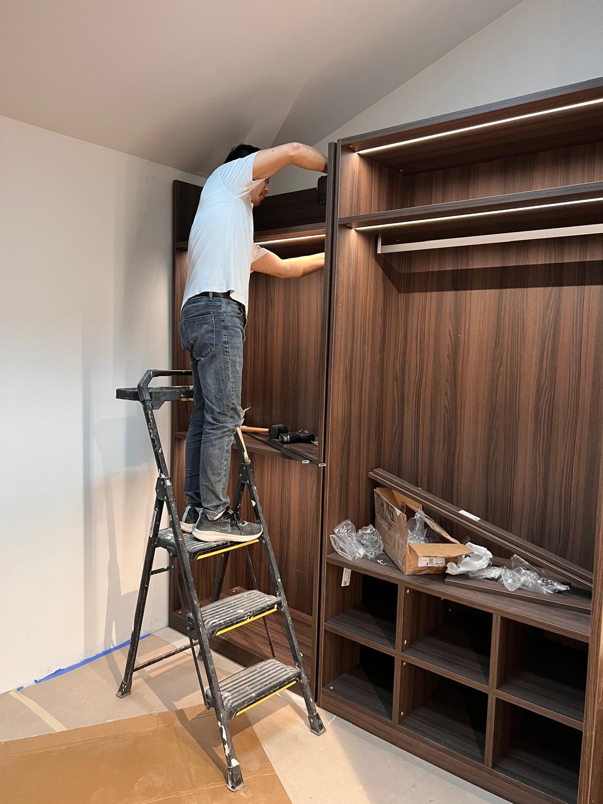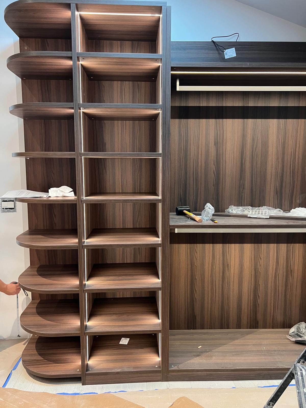 A sleek and modern walk-in closet is taking shape with premium wood finishes, integrated LED lighting, and tinted glass doors. The custom cabinetry and shelving are being carefully installed to create an elegant, functional space for organized living.
