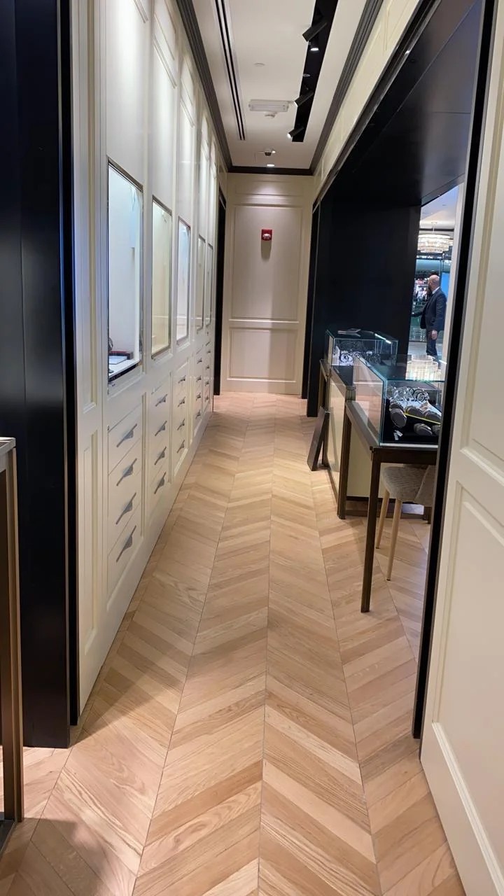 - The store features marble flooring, chevron wood patterns, and crystal chandeliers, creating a sophisticated ambiance.