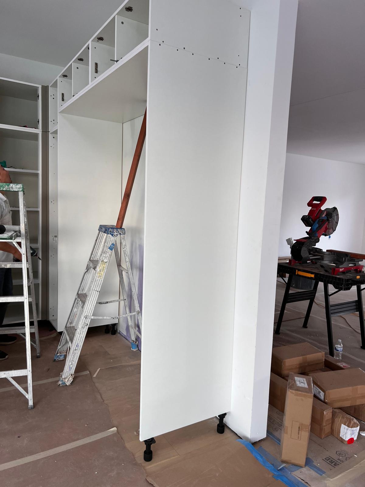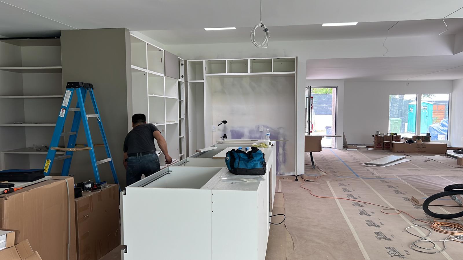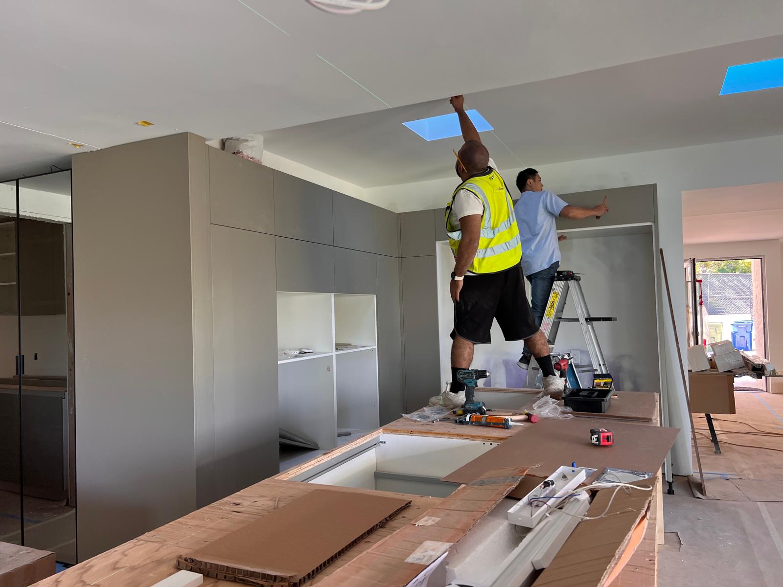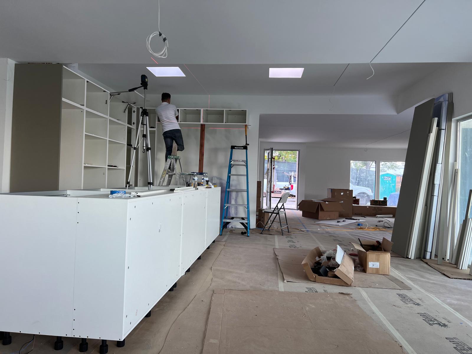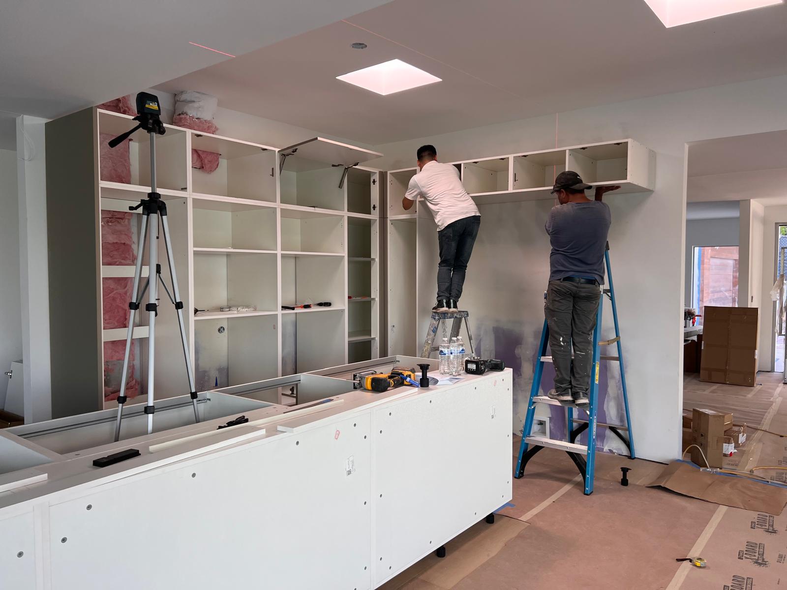 These images showcase the ongoing installation of modern kitchen cabinets, illustrating the step-by-step transformation from bare wall frames to structured cabinetry. The work includes wall-mounted units, custom shelving, and integrated storage solutions with sleek finishes.