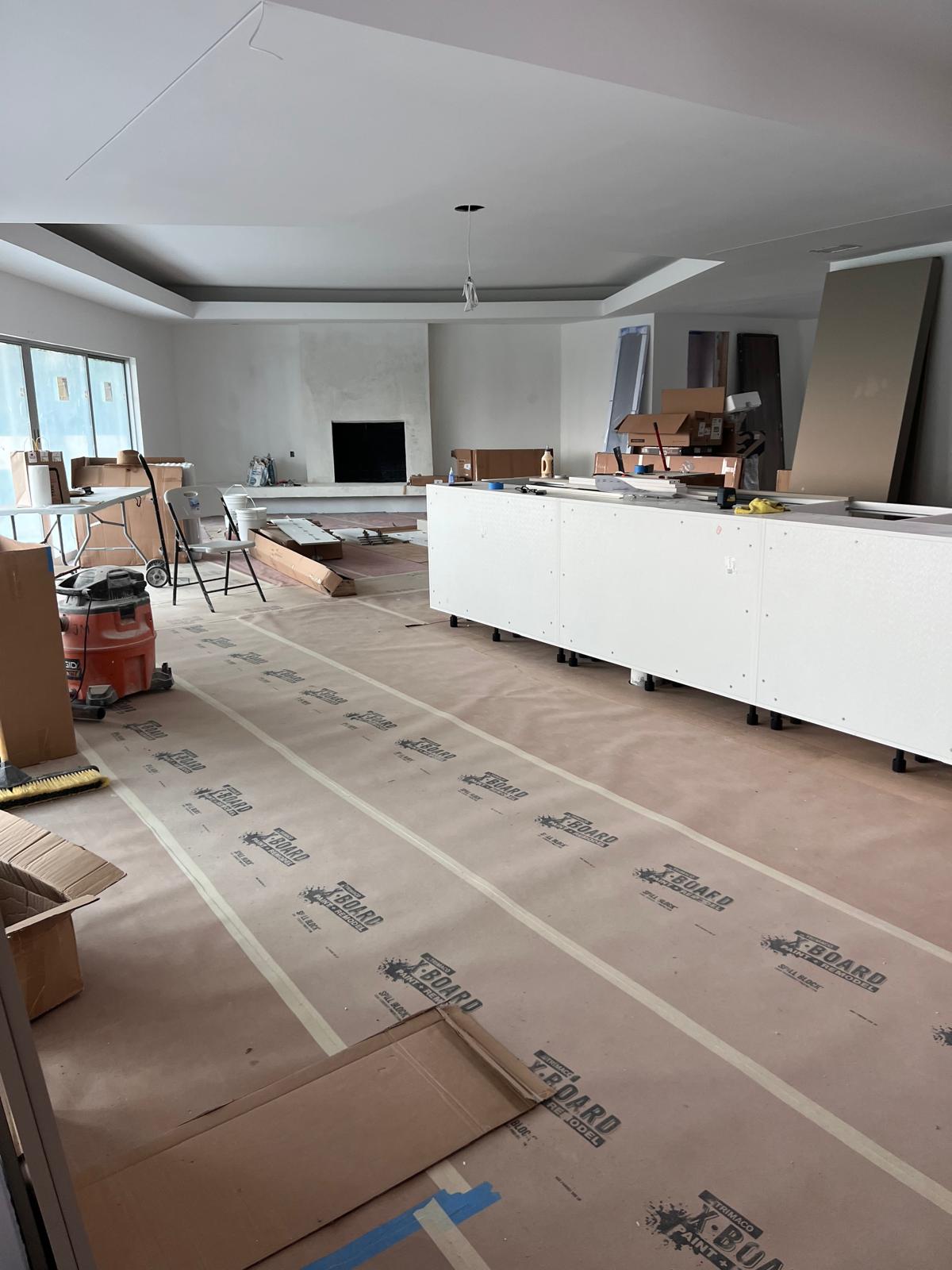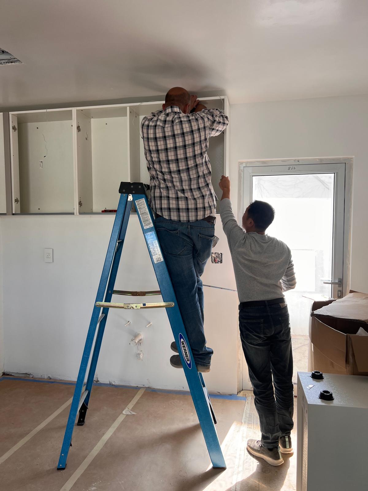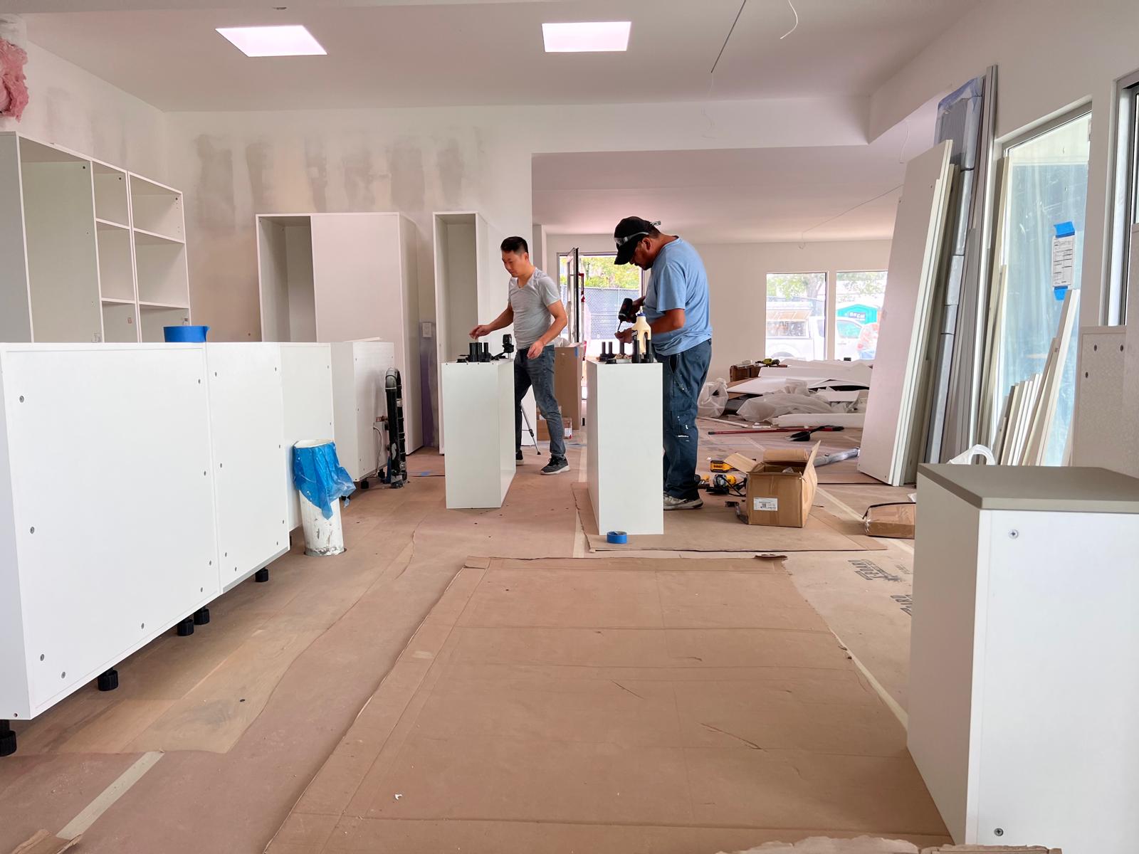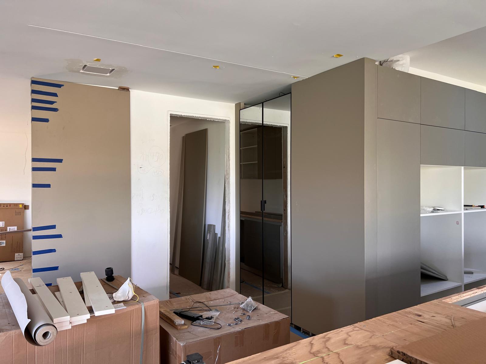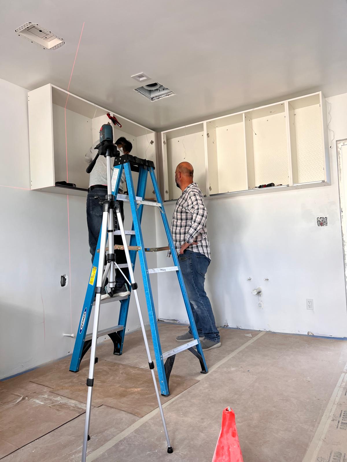 These images showcase the ongoing installation of modern kitchen cabinets, illustrating the step-by-step transformation from bare wall frames to structured cabinetry. The work includes wall-mounted units, custom shelving, and integrated storage solutions with sleek finishes.