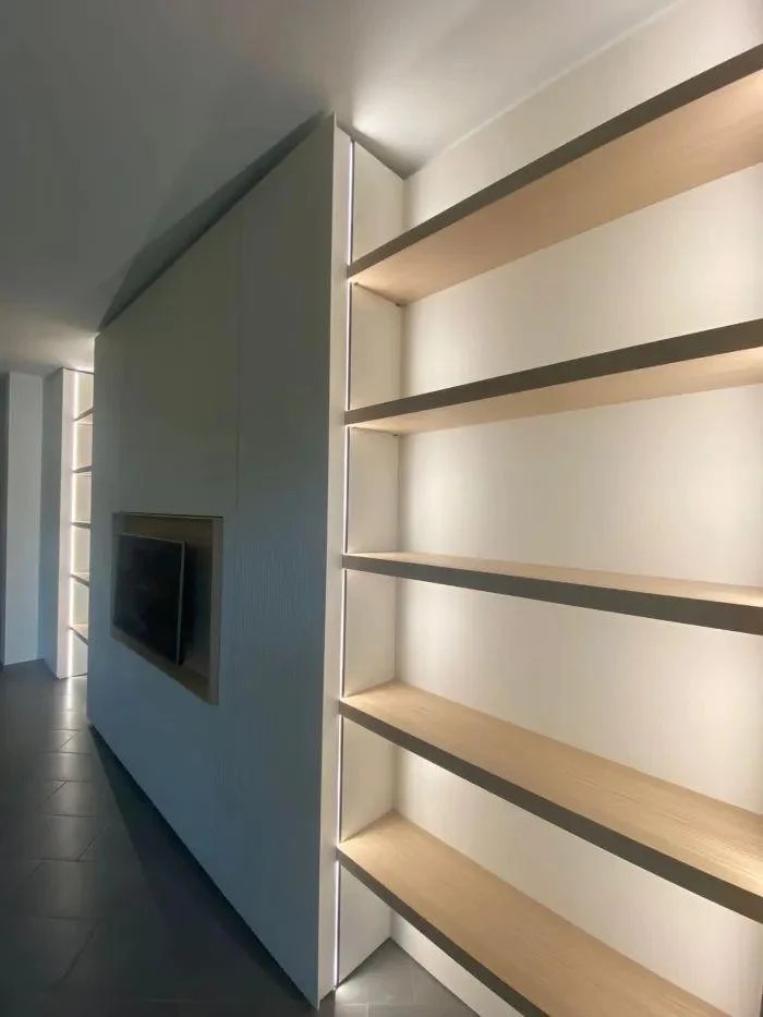 This sleek TV wall design features clean vertical paneling and integrated lighting. With natural wood accents and warm backlit open shelves, it blends form and function to elevate any living space with contemporary elegance and practical storage.
