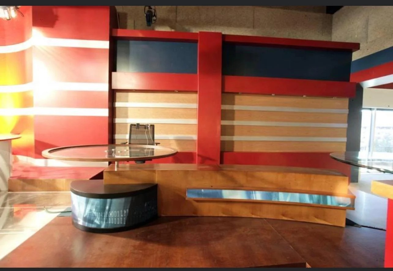 This series of images showcases the construction and setup of a modern news studio, featuring a dynamic blend of red, blue, and wooden finishes. The studio combines functionality with aesthetic appeal, ensuring a professional environment ideal for live broadcasts.