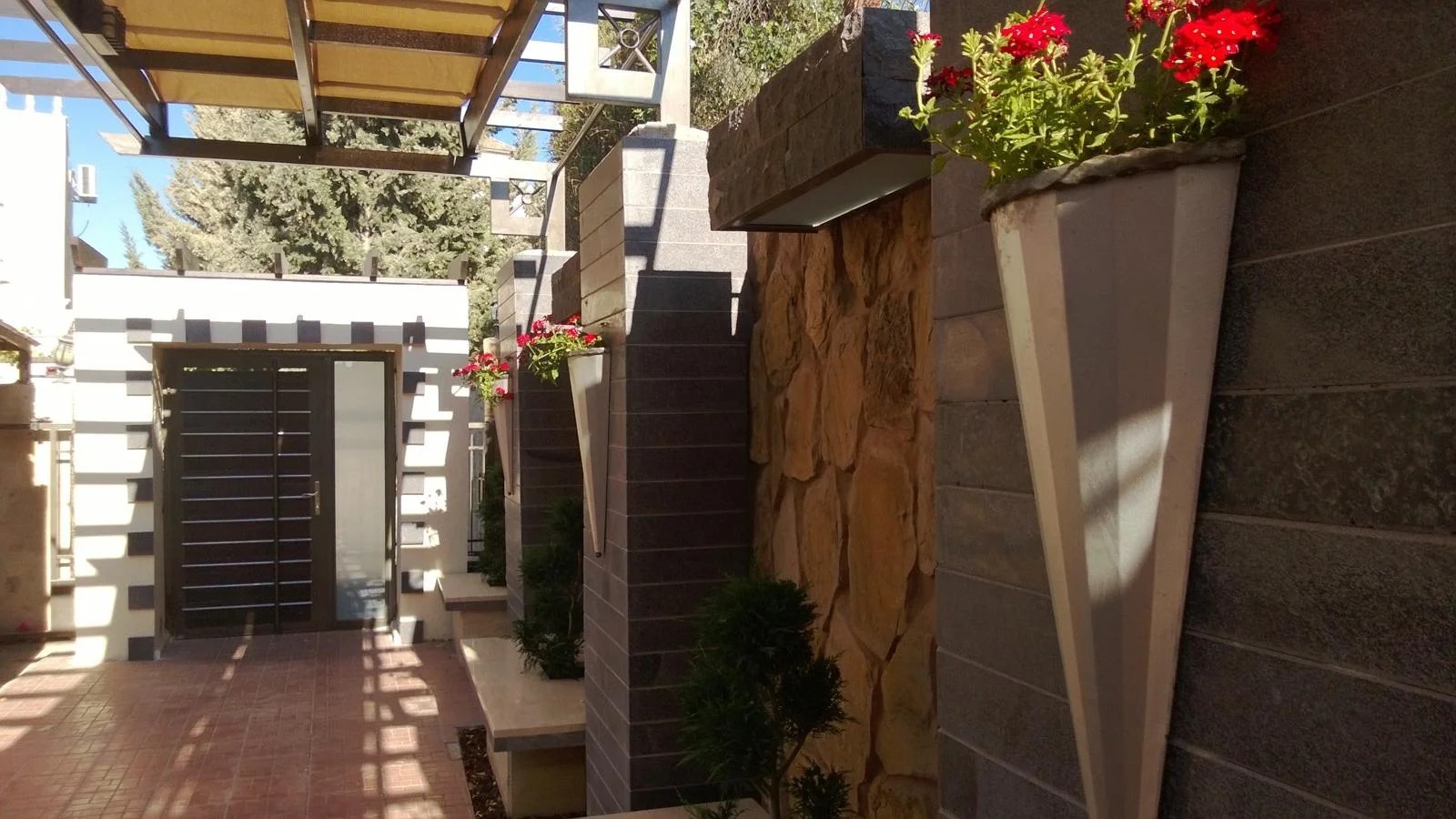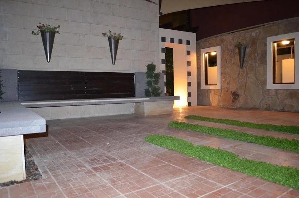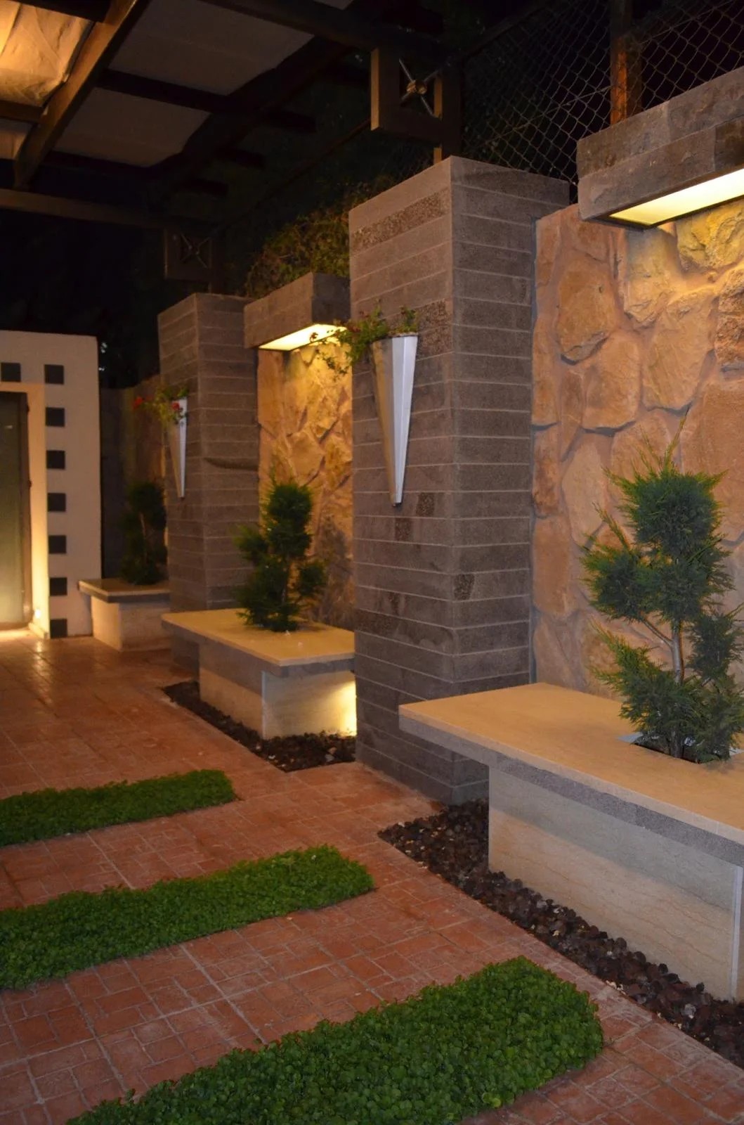 This stylish outdoor courtyard blends contemporary elements with natural textures, featuring stone walls, sleek metal pergolas, and minimalist garden seating. Vertical planters and ambient lighting enhance the space’s charm, making it ideal for relaxation or entertaining guests in both day and night settings.