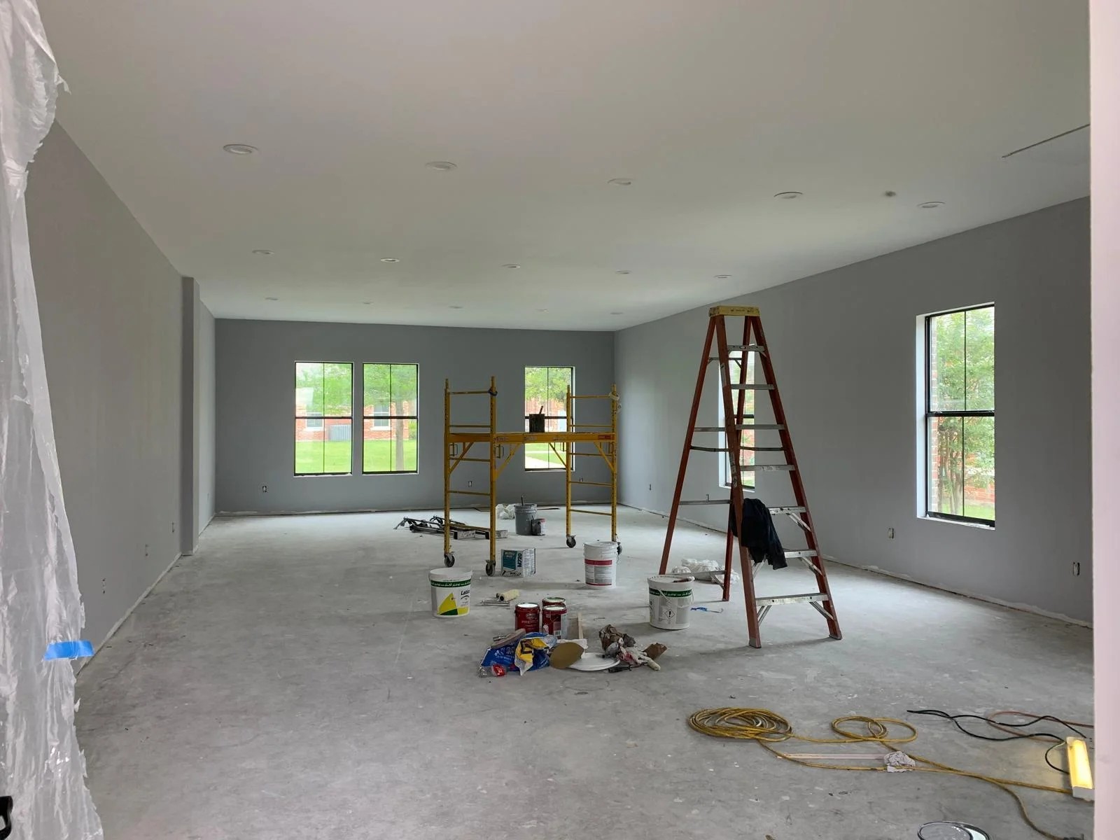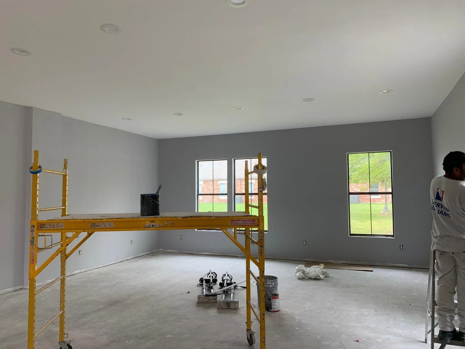 - Skilled workers are actively painting, setting trim, and preparing for the final interior finishes.