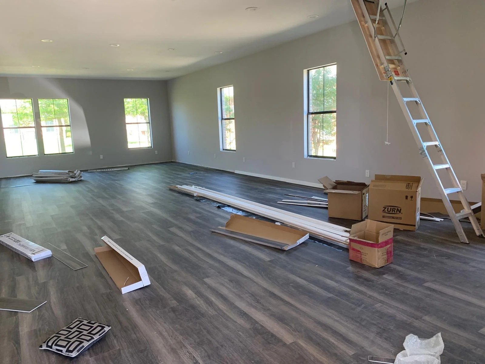 These images capture a beautifully lit space undergoing detailed interior finishing. Workers are seen carefully preparing floors, painting walls, and completing ceiling lighting installations, reflecting a refined, modern design approach.