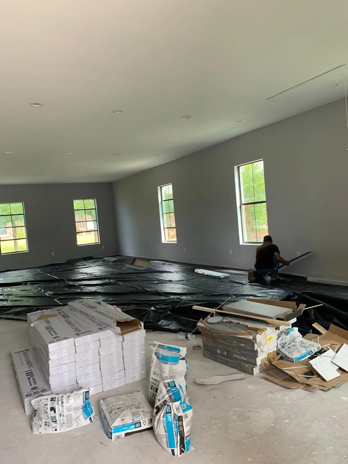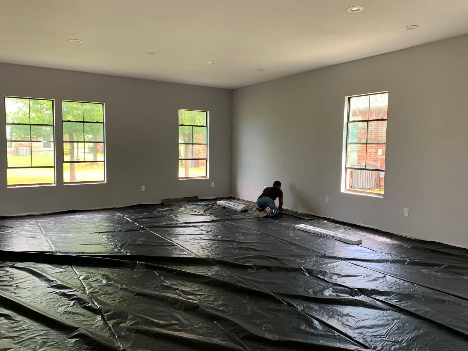 - Plastic sheeting covers the floor in preparation for final flooring installation, ensuring dust protection.