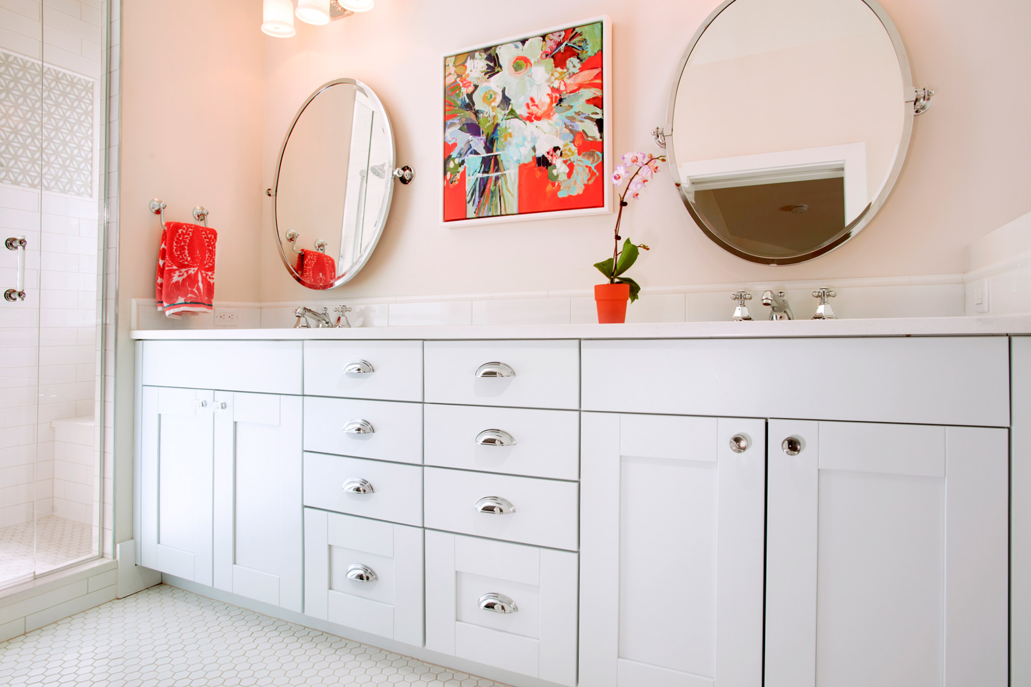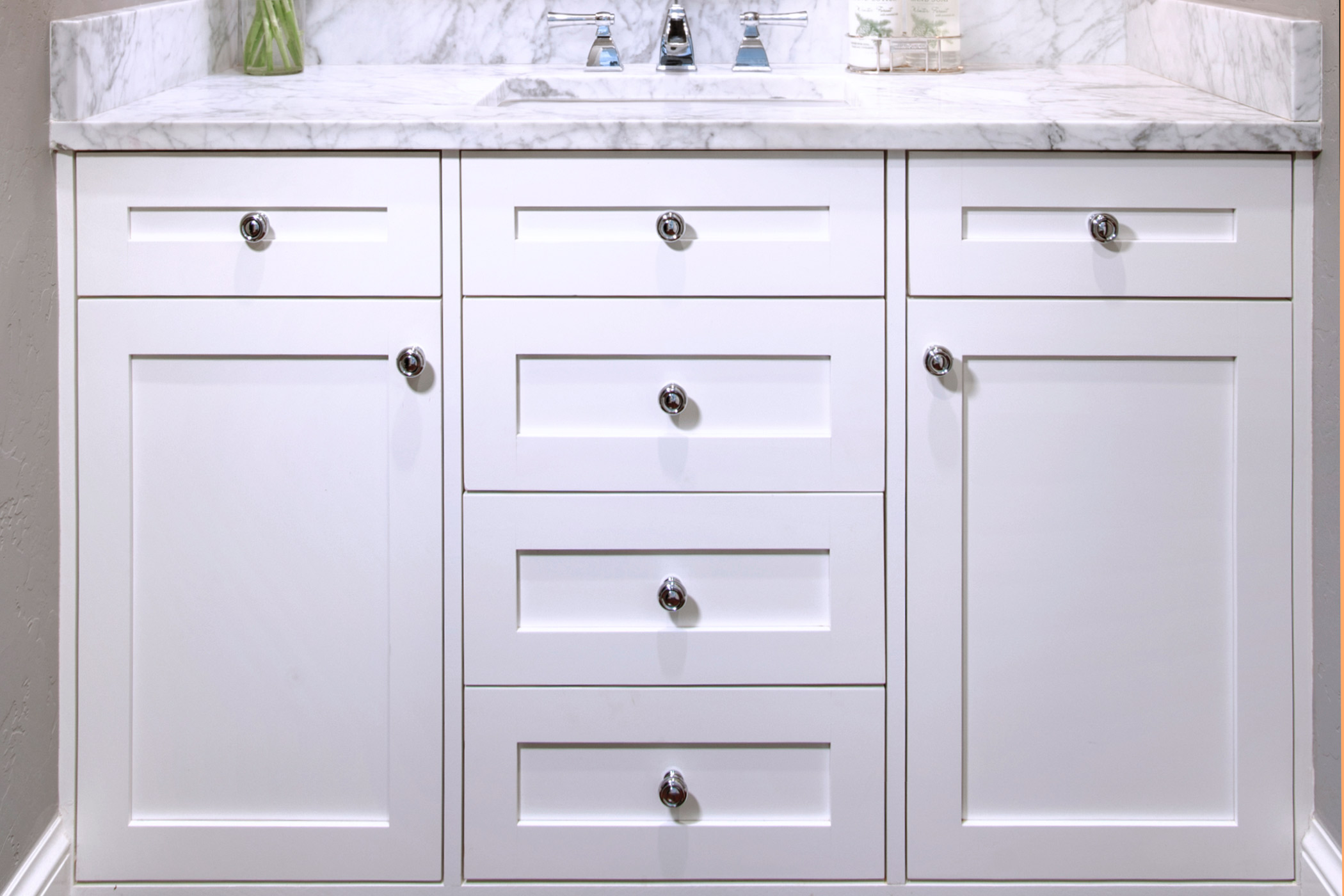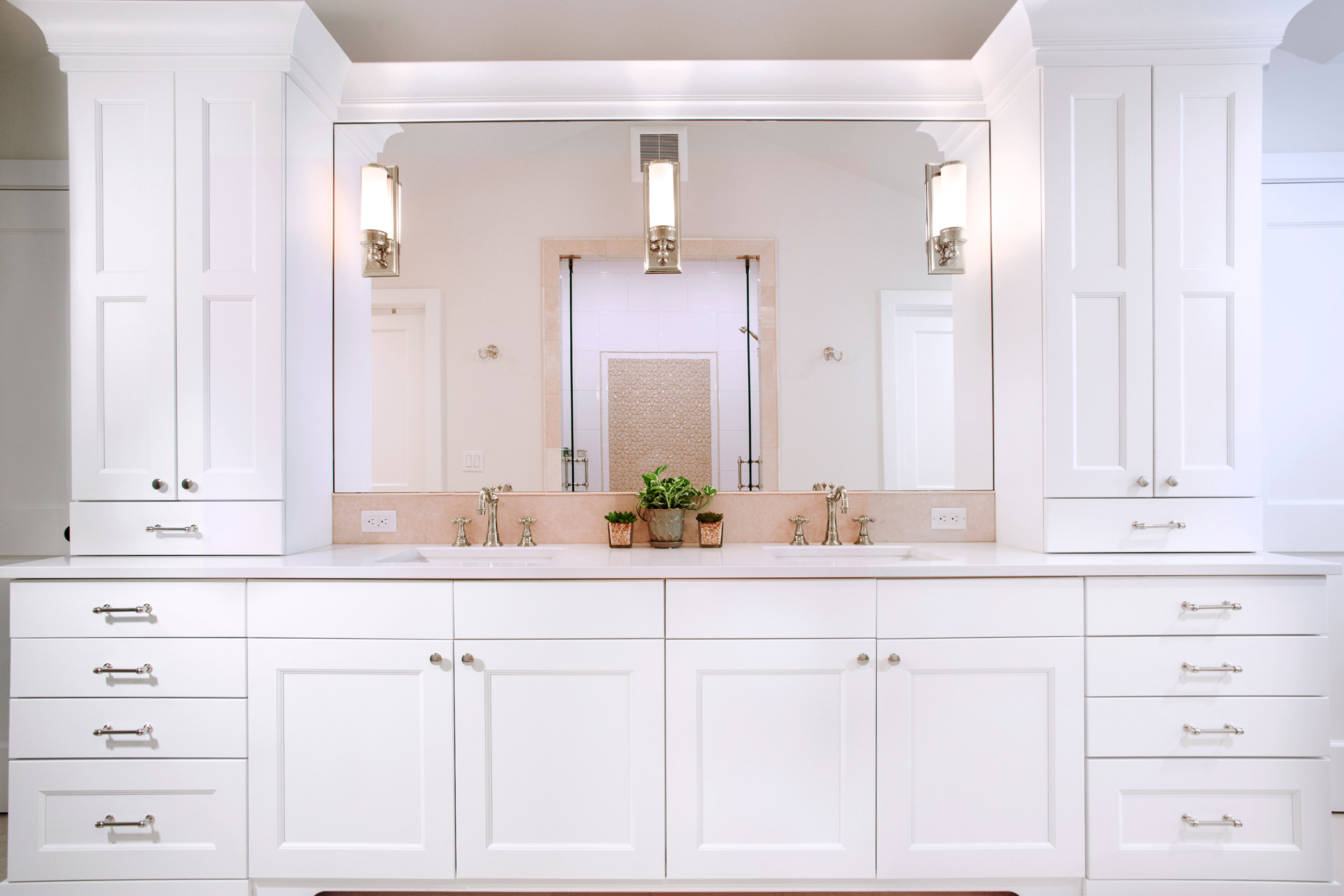 A bright, modern bathroom featuring crisp white cabinetry and sleek marble countertops. This design emphasizes openness and luxury, seamlessly connecting to the adjoining bedroom.